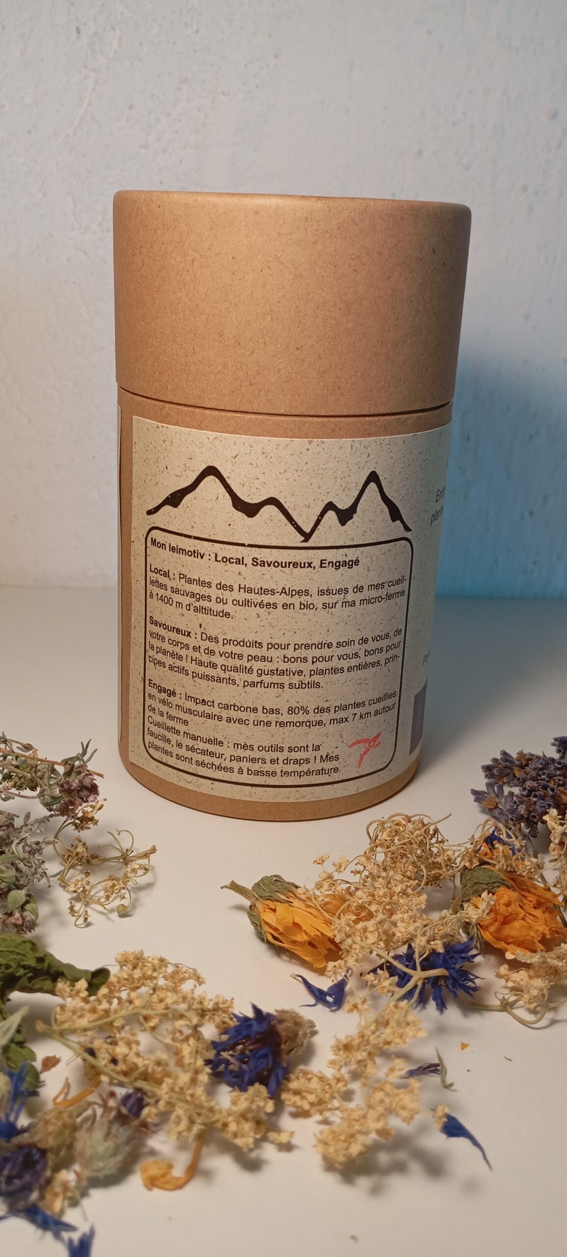 Local : Plantes des Hautes-Alpes, issues de mes cueillettes sauvages ou cultivées en bio, sur ma micro-ferme à 1400 m d’altitude.
